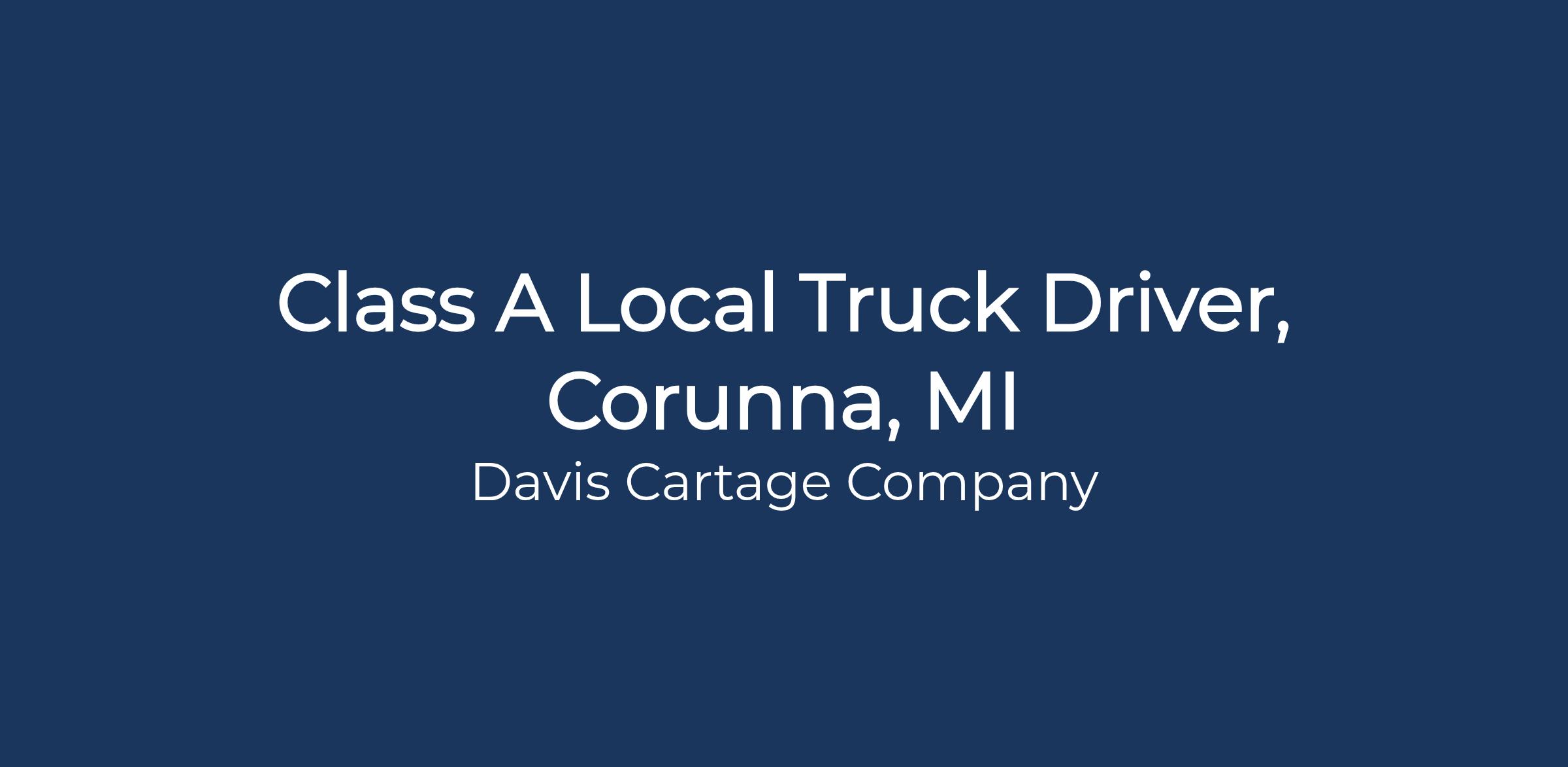 We are hiring a Class A Truck Driver to join our team in Corunna, MI. This position is Monday through Friday, day shift, approximately 10-12 hours per day with weekends off. Davis Cartage Co. is a common carrier operating primarily in the state of Michigan. Our fleet consists of Cascadia Freightliners, day cabs and sleepers, as well as 53' dry vans. Davis Cartage Co. offers competitive wages and Drivers are paid weekly. Benefits include dental, medical, vision, 401k, paid time off, safety bonuses, disability, life insurance and more. Qualified candidates must have two years of verifiable driving experience, have a clean MVR, and be able to pass a pre-employment drug screen. Davis Cartage Co. has been in business since 1941 providing Transportation, Warehousing and Logistics. To learn more about Davis Cartage Co., please visit our webisite www.daviscartage.com and see us on Facebook.